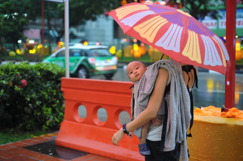 In the end I decided to look around for people. Practically speaking it is always challenging to take candid photos without people glancing at the camera.  Misunderstandings may or may not occur when doing such photos. Anyway, I saw this baby attached to the mum via a carrier. The mum was waving to someone and the umbrella was hiding her face from view, lending a sense of mystery to the photo. Also the umbrella helps as I wanted the baby’s face to be the main anchor point of the photo, therein lies the ‘attachment’ of the baby in both body and love.”