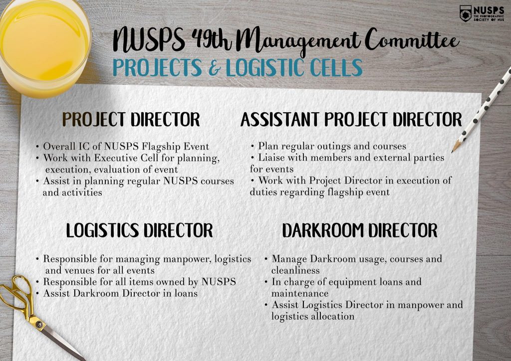 -The Projects and Logistics Cell comprises of the Project Director, Assistant Project Director, Logistics Director, and Darkroom Director!